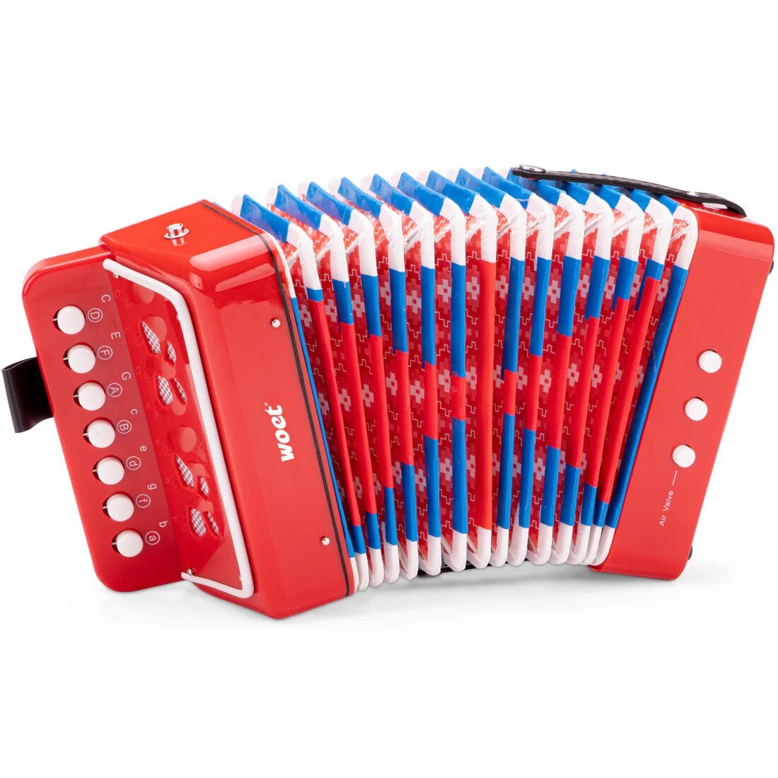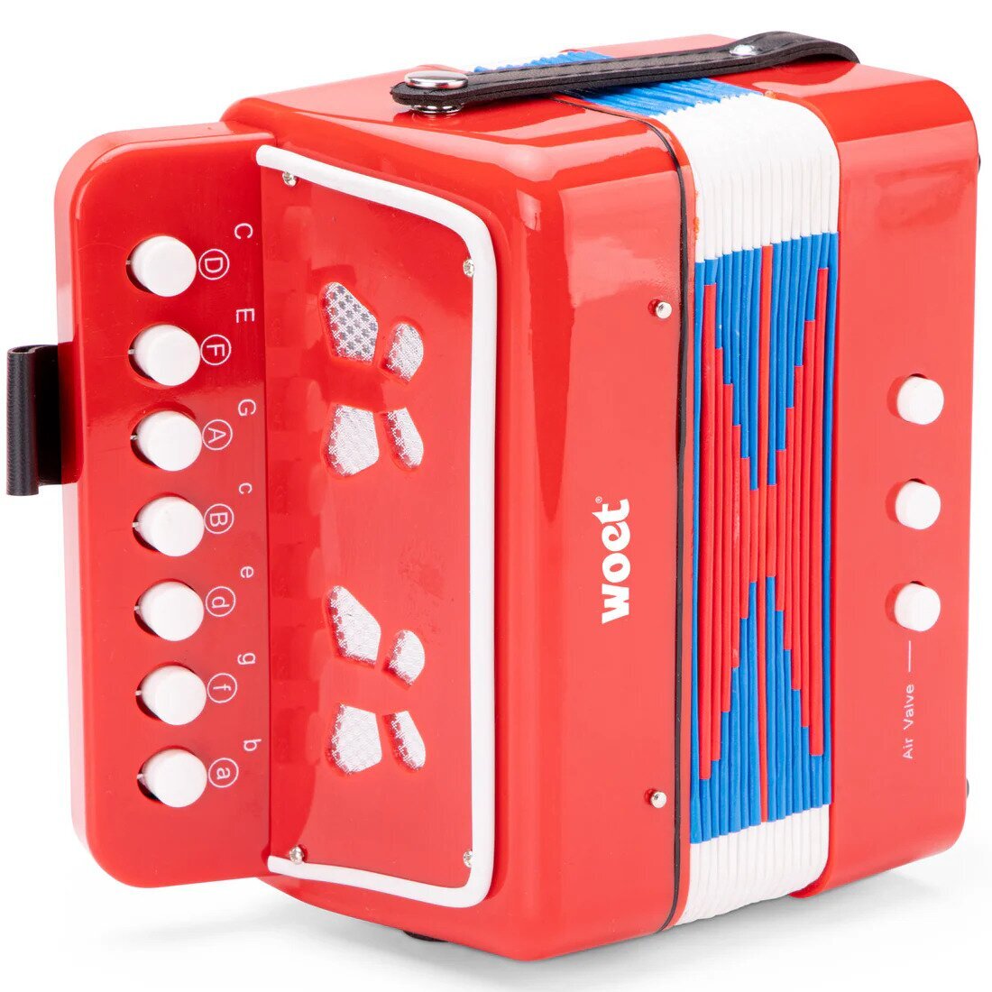 Ein schönes rotes Akkordeon mit Schultergurt. Enthält ein Musikbuch mit mehreren bekannten Kinderliedern und einer einfachen Erklärung, wie die Harmonika gespielt werden soll. Dieses Instrument verfügt über zwei Bassknöpfe, einen Bass-Side-Air-Knopf und sieben Höhen in C.