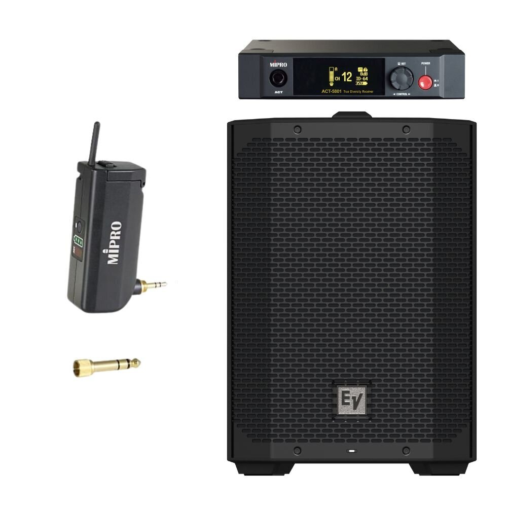 Über das Everse 8 Tray B ist der MIPRO ACT-5801 Funkempfänger direkt am Lautsprecher montiert und wird ohne separates Netzteil mit Strom versorgt. Dazu gehört der MIPRO MT-58 Anstecksender, der direkt an Instrumente, Laptops oder andere Audiogeräte angeschlossen wird und das Signal kabellos überträgt. So entsteht ein komplett kabelloses System, das sofort einsatzbereit ist – ideal für Hochzeiten, Events, Moderationen, Workshops, Schulen oder Outdoor-Auftritte.
