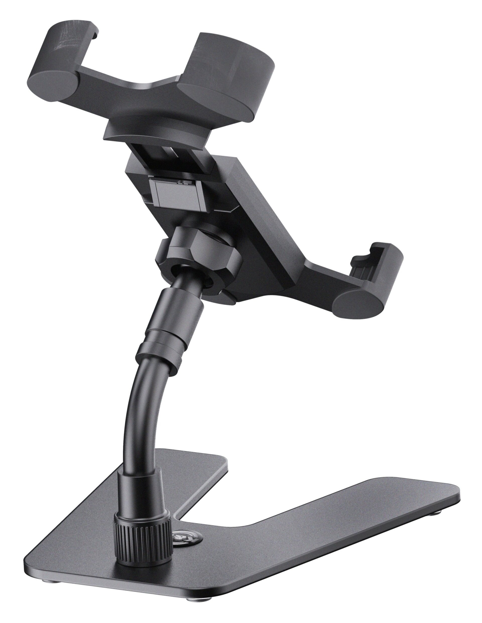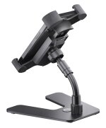 Dank des flexiblen Kugelgelenks kann der Halter nach oben und unten geneigt und um 360° gedreht werden. Der flexible Haltearm mit einer Länge von 100 mm sorgt für zusätzliche individuelle Positionierung. Ein attraktiver Metallsockel mit rutschfesten Gummiauflagen sorgt für optimale Standsicherheit.