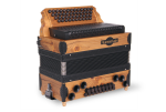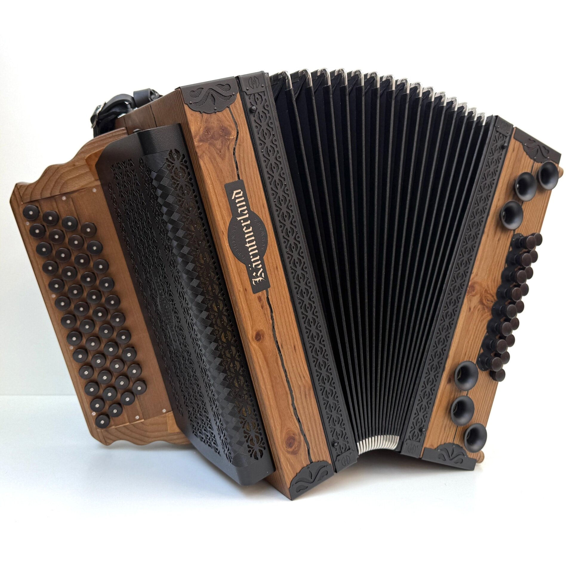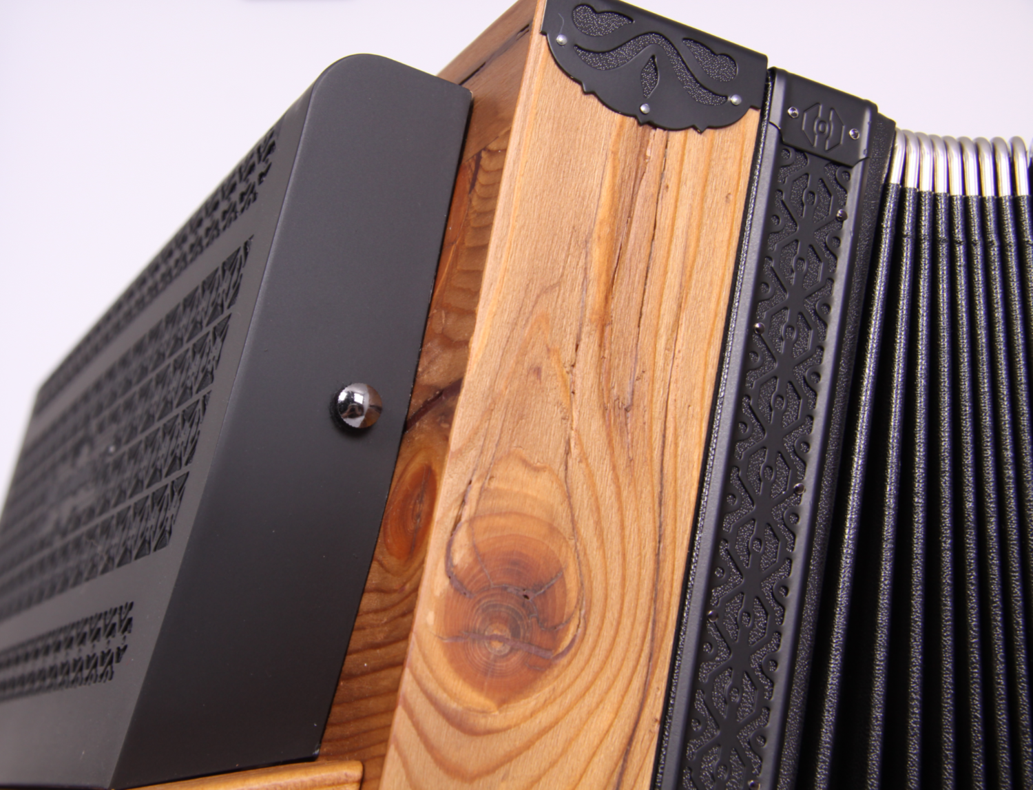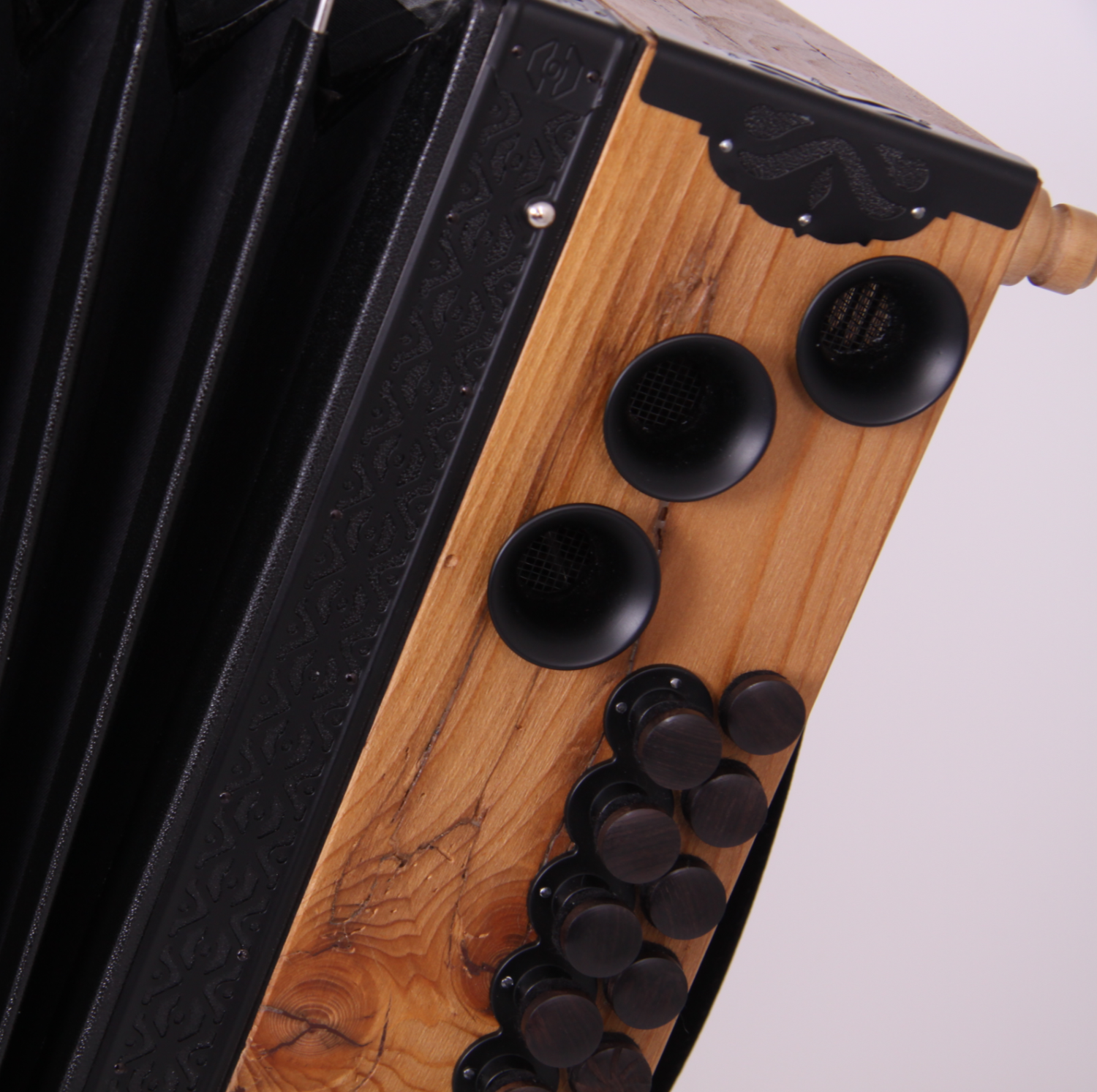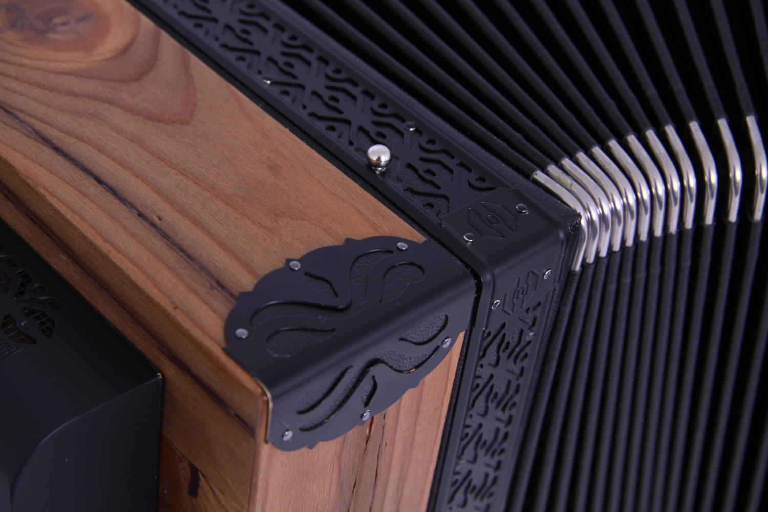 Bei dieser Harmonika wird speziell getrocknetes Holz aus Altfichte verwendet. Durch eine besondere Bürstung wird die Eigenstruktur perfekt herausgearbeitet und jedes Modell wird somit zum Unikat.