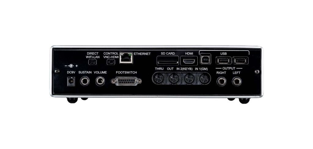 - Hintere Verbindungen : Main Out Links / Rechts. Sustain Pedal. Lautstärkepedal. Fußschalter. Midi In1, Midi In2, Out, Thru, 2 x USB-Gerät. USB-Host. HDMI, Ethernet.