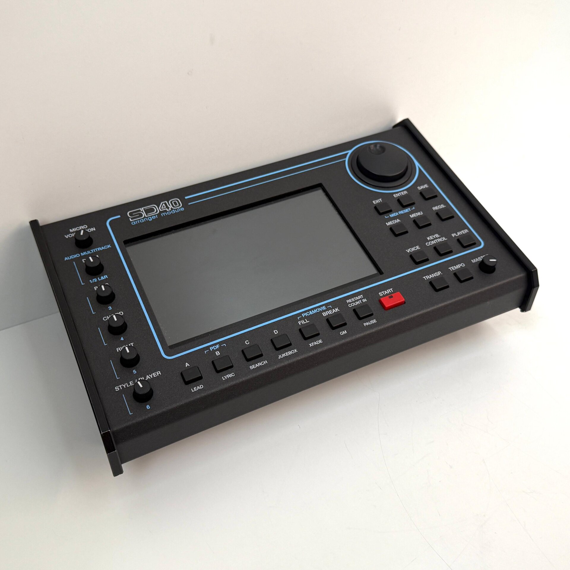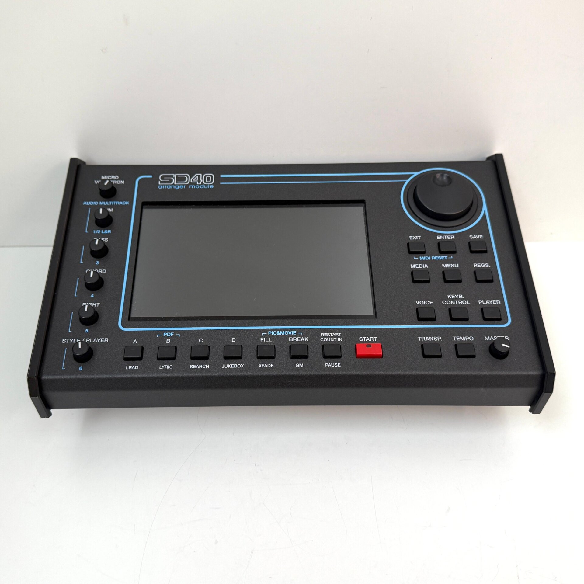 Das SD40 verfügt über einen professionellen Player, mit dem MP3, MIDI (verschiedene Formate mit Lyrics), WAV, FLV, CDG, MP4, AVI, M4A, JPG, TXT Dateien wiedergegeben werden können. Hierbei stehen Funktionen wie Cross Fade, Lead Mute und sowohl die alphabetische als auch die numerische Suche zur Verfügung. LYRICS, TEXT und KARAOKE können auf moderne Art und Weise auf dem Display des Geräts oder auf einem externen Monitor ( DVI ) visualisiert werden, zusammen mit Filmen, Video Clips oder graphischen Dateien in PDF Format, wie z.B. Music Scores. MY FOLDER ermöglicht das Erstellen von Custom PLAYLISTS und den schnellen Zugang zu den Favoriten und den am meisten verwendeten Dateien. Auch die JUKE BOX Umgebung ermöglicht einen schnellen Zugriff auf die Songs, zusammen mit der neuen RESTYLE Funktion, mit der die Drum Track einer MIDI Datei mit den internen Audio Drums ersetzt werden kann. Ein weiteres wichtiges Merkmal des SD40 Players ist die AUDIO MULTITRACK Funktion, die es ermöglicht, die einem Audio Projekt entnommenen Multiple Wave Dateien abzuspielen. Die Lautstärken der 6 Tracks können individuell über die Potis auf dem Bedienfeld kontrolliert werden, und es besteht auch die Möglichkeit, das Click Metronome über den Kopfhörer Ausgang (Aux) nach Außen weiterzuleiten.