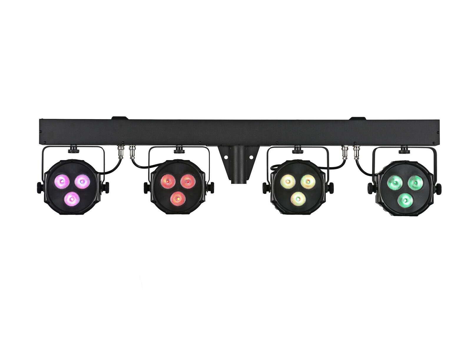 Bar mit 4 lichtstarken 4in1 QCL RGB/WW-Spots, AirW-Funkeinheit (2,4 GHz), Funkfernbedienung und Transporttasche