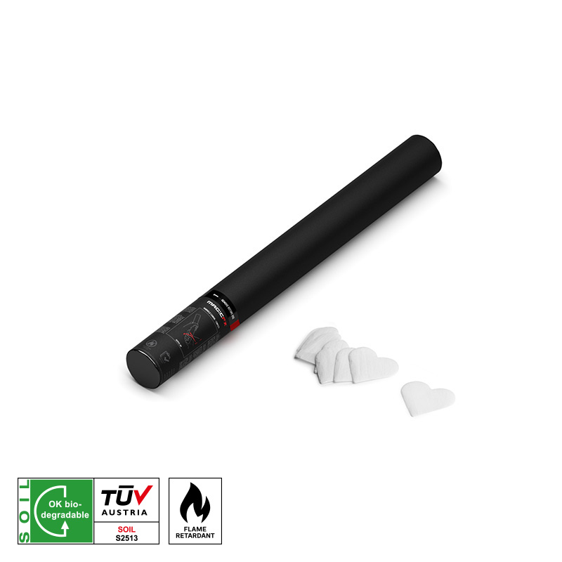 Schießen Sie flammhemmende (B1) Papierkonfettiherzen mit diesem Handkonfetti-Shooter in die Luft. Diese 50-cm-Kanone kann Konfetti bis zu 8 Meter abschießen.