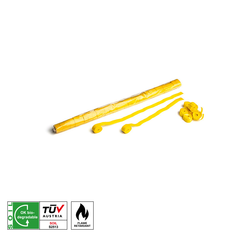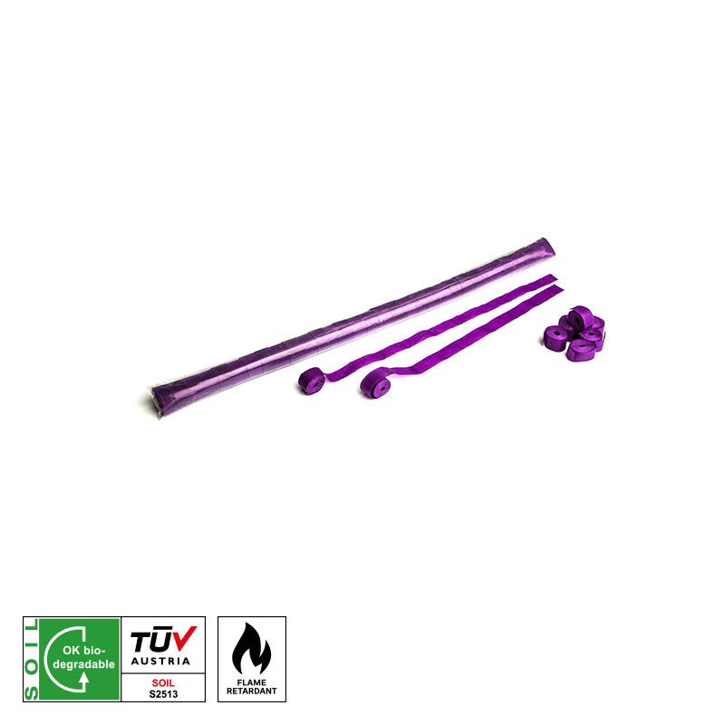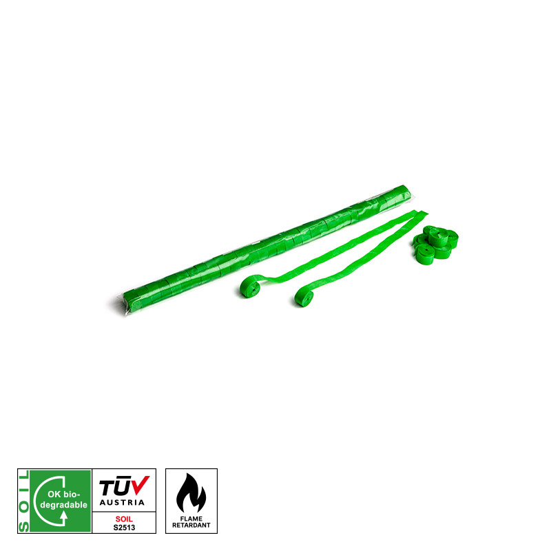 Hochwertige, schwer entflammbare (B1) MAGIC FX Papierstreamer für den professionellen Einsatz. Die Farben Dunkelblau, Dunkelgrün, Hellblau, Hellgrün, Mehrfarbig, Orange, Rosa, Violett, Rot, Schwarz, Weiß und Gelb sind vom TÜV als biologisch abbaubar zertifiziert.