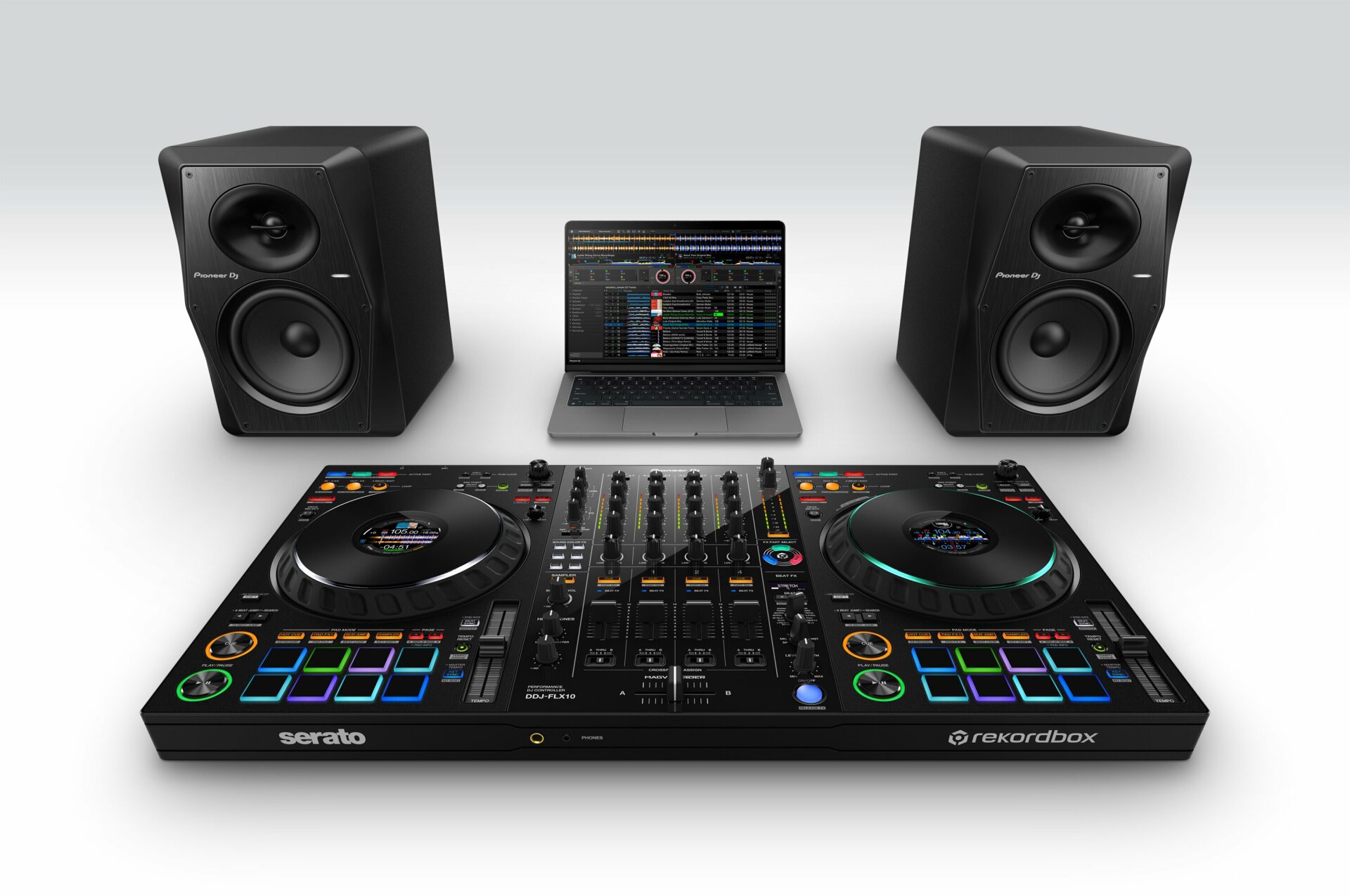 Der DDJ-FLX10 bietet kostenlose Plug-and-Play-Kompatibilität mit rekordbox und Serato DJ Pro, sodass du deine bevorzugte Software direkt steuern kannst. DVS-Unterstützung ist für rekordbox über ausgewählte Abonnements und für Serato über eine kostenpflichtige Lizenz/ein kostenpflichtiges Abonnement für die Serato DJ Expansions oder die Serato DJ Suite verfügbar.