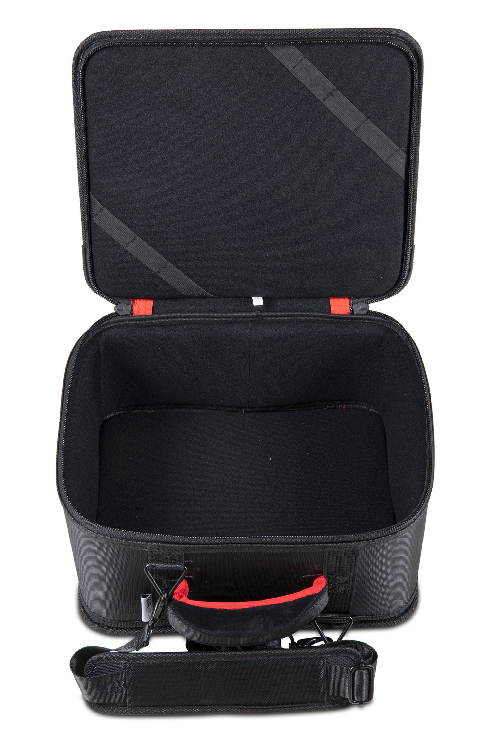 Das exklusive Side Protection System (SPS) bietet enormen Schutz durch seitliche Fiberglas-Einlagen und 20 mm starken High-Density-Schaumstoff. Der Boden ist vollständig mit Gummiprotektoren bewährt. Im Inneren sorgt eine weiche Fleece-Fütterung für schonenden, kratzfreien Transport. Sicher in der Hand, im Auto, im Tourbus.